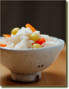 3.将米洗好,红萝卜切丁与山药、银杏调上自己喜欢的口味,一起放入电饭锅煮,简单又 好吃。