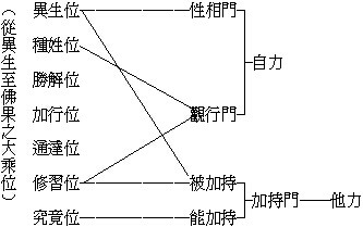 加持门全仗他力。若性相门、则从异生至佛果平等平等,如八识因果染净虽有差别,而八识一也;观行门、除异生位未起观行和佛果位观行已圆,其中种姓位至修习位皆具观行,此二者唯仗自力。兹就境、行、果三门通别,特摄一表如