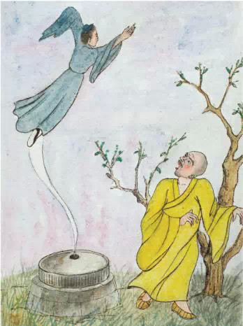 从前有一僧人,向来不务修行,却有投机取巧之能。听说中药黄精,能使人长生不老,为了试验是否灵效,便把黄精放在枯井里,然后引诱人陷入井中,再用磨盘盖住井口。被害人在井内急迫惶恐,无计可出时,忽然来了一只仙狐靠着井,告诉陷井里的人说:“请您不必忧虑,我教你方法逃出。我是通晓天道的仙狐,在坟墓里作穴居住,卧在穴中,目光注视穴口,时间久了,便能飞出,这就是仙经上所说的‘神能飞形’的道理。请您就一心注视磨盘上的孔洞,时久便能飞出。以前我曾经被猎人捕获,承蒙您慈悲赎命救我,因此特来报恩,望您不要忽视。”陷井里的人便照仙狐的方法,经过十多天,果然从井飞出,脱离灾难。