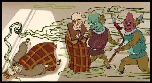 有一天,雄俊法师突然暴亡,被小鬼押着前往阴间。