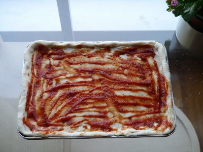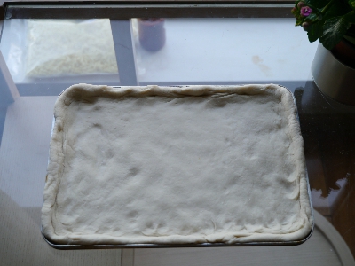 2,烤盘中展开面团成饼,中间薄,四边厚。注意:方盘上放锡纸,扫上橄榄油;为了更入味,可在饼上用牙签扎眼儿;