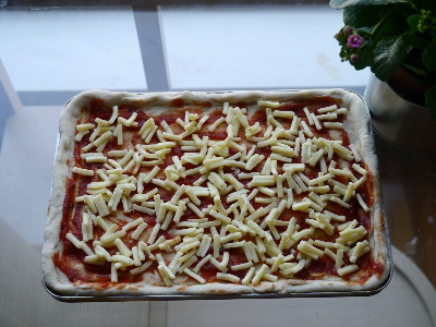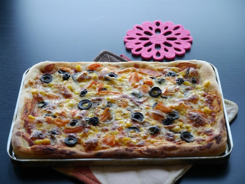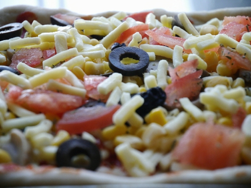 4,依次撒上芝士碎,口蘑片,熟玉米粒儿,蕃茄丁儿,黑橄榄圈儿,最后在撒点芝士碎;