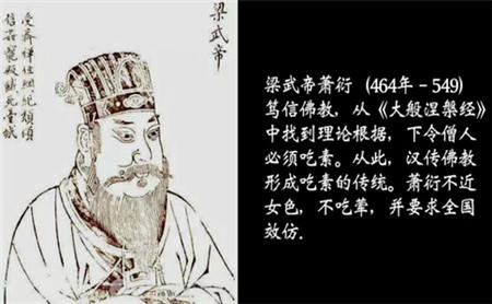 梁武帝是一个比较虔诚信仰佛教的皇帝,他的虔诚也是不能够用佛法的高要求来看的,如果用高要求来看的话,他的很多东西也是不符合的,当然他有他的私心杂念,他提倡吃素,并且身体力行,这也是事实。可是因为他的吃素也闹了一些佛法方面的笑话,当然更闹了一些佛法知见方面荒唐的事情,由于他的提倡,汉传佛教吃素的风气就漫延开来,并且到现在已经成为汉传佛教的一大特色。