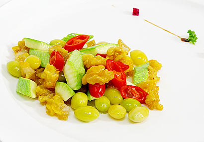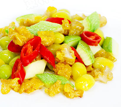 新年第一菜银杏炒西葫芦(图片来源:慈实) 末日爽约,新年却如约而至,那我们就要一如既往,保持健康饮食的同时,当然也要美味的素菜来让我们的生活更有味道。 开年第一菜,一起来学、一起品尝吧。 金耳在广东习惯称之为黄耳,真正的名词为金耳,菌肉细嫩。黄耳有阵阵幽香,口感脆滑,是高级宴会上的名贵佳肴之一,也是补益身心、延年益寿的著名滋补珍品。 黄耳生长在海拔1900~3300公尺,还含有相当丰富的酸性异多糖等抗衰老、抗炎症、抗放射及抗癌症物质,可治疗心、脑血管病,抑制癌细胞,是心脏病、肝炎及肿瘤病人的食疗佳品。此外,黃耳还有增强机体免疫力的作用。由于黄耳富含胶原蛋白和氨基酸,常吃可以滋阴、养颜、润肺、清心安神、滋润肌肤,保持青春健美。 开年第一味:银杏炒西葫芦(图片来源:慈实) 食材: 西葫芦,红杭椒,黄耳,银杏。 制作方法: (图片来源:慈实) 1.黄耳用温水浸泡透,削去根,洗净泥沙,切成块,上笼蒸熟。 (图片来源:慈实) 2.西葫芦洗干净,去除中间瓜瓤,切长条,然后用波浪刀切菱形块。 (图片来源:慈实) 3.红杭椒洗干净,切斜刀圆圈块。 (图片来源:慈实) 4.新鲜银杏剥壳。 (图片来源:慈实) 5.净锅内倒入油,油温升至4成左右,放入银杏、西葫芦块分别滑油,倒出沥干油。 (图片来源:慈实) 6.锅内倒入适量初榨橄榄油,放入姜片、红杭椒煸香,放入黄耳煸炒,加少许水,放入西葫芦块、银杏调中火略微煸炒。放盐、蘑菇精,勾一点点薄芡,出锅装盘即可。 银杏炒西葫芦(图片来源:慈实)