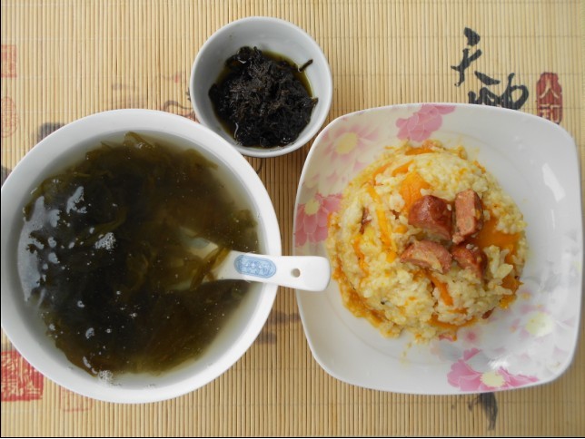 所需原材料:老南瓜、素腊肠、冷饭。