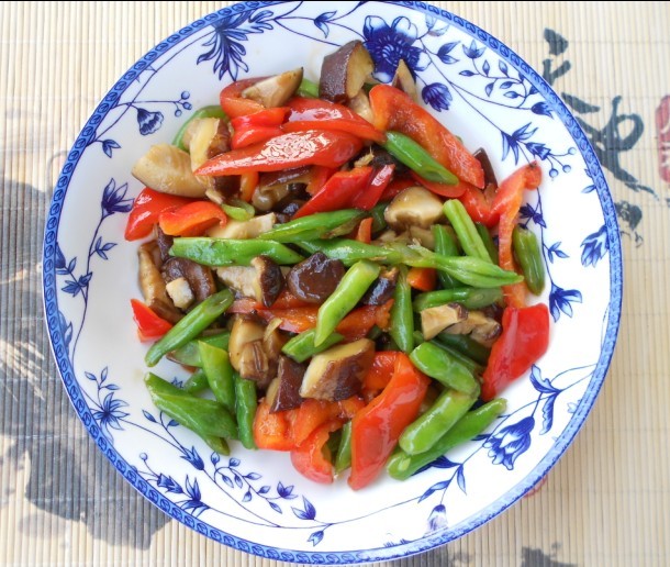 2、 倒油,放老姜末,放香菇翻炒出香味,再放红椒继续翻炒,最后放四季豆,炒约两分钟后,放盐,少许生抽、少许素蚝油就OK了(这道素菜不用放磨菇精,吃素菜的本味)