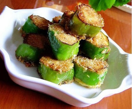 尖椒4个、豆腐250克、面包糠、食用油、盐、胡椒粉、蘑菇精。