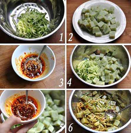 6、 取6倍于绿豆淀粉的黄瓜汁倒入绿豆淀粉,拌匀