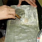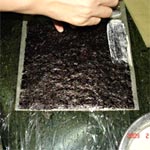 2、拿一片豆皮、在海苔上涂上面糊,涂好贴在豆皮上,重复此动作,豆皮可多作几层再贴一层海苔,豆皮不够可以接。