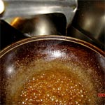 6、关火锅中的油倒出,在不开火的情形下加入调味料,调味加好开火,调味料煮到有稠度(大泡泡很多很多)加香油;放入炸好素小鱼干拌匀,起锅趁热时再拌入白芝麻。