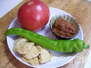 原料:番茄、豆腐干、尖椒、黄豆酱(或普通黄酱)