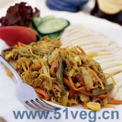 2. 炒锅入油,用洋葱丁、蒜片和姜丝炝锅,放入蔬菜丝一同炒,出锅时加入盐、白醋、黑胡椒调味即可。