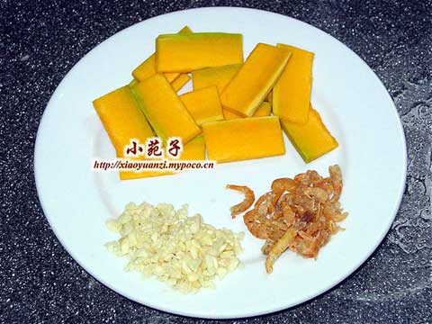材料:南瓜适量去皮切长方片、蒜蓉2匙