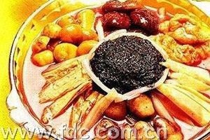 6.将白菜段、栗子、笋片、腐竹段、面筋放入汤碗,上面码上香菇、发菜、撒上花生米,加水、精盐、腐乳汁,上锅蒸30分钟;