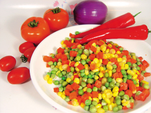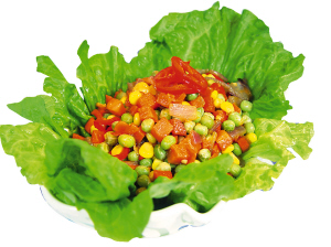 什锦丁(玉米、红萝卜和青豆,半斤)、洋葱(半个)、番茄(2个)、红辣椒(1个)、生菜叶(4片)