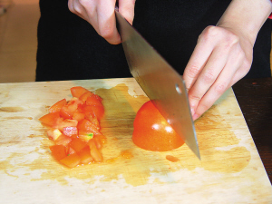 洗净番茄、辣椒,番茄切成小块,辣椒切成圈。