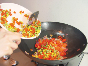 放入什锦丁和3汤匙水,继续煸炒1分钟,加1/2汤匙蚝油、1/5汤匙盐调味,便可出锅。