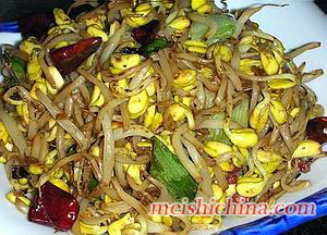 2、锅里放油,炒香葱段和干辣椒,然后放煸过的豆芽,翻炒1分钟,加盐、味精,装盘!