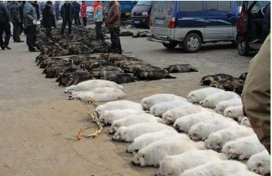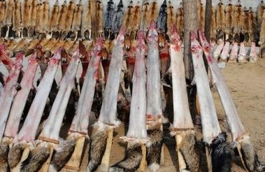在中国的皮草集散市场上,屠宰者会先以木棍敲击狐狸与浣熊头部,或是抓住动物的尾部将整只动物举起来后,将头朝下重重往地上摔。这些动物往往不会立刻断气或昏厥,而屠宰者还是会继续活剥牠们的皮。图中这头狐狸在被剥皮过程不断挣扎,工人数度用刀敲击牠的头部,最后索性用双脚踩上牠的头,企图让牠断气,但狐狸还是痛苦的被活生生取皮!
