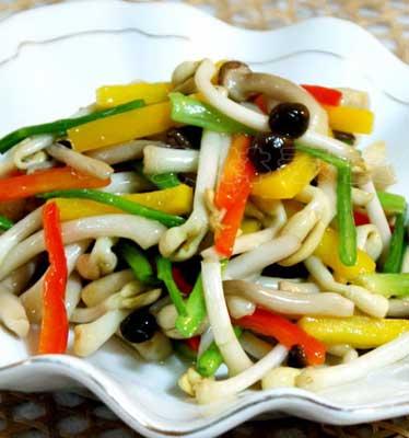 6、另起锅,锅里放少许油,倒入蟹味菇略炒一会儿,放入黄椒、红椒丝、花生芽、芹菜一起炒,火要旺动作要快,这样炒出的菜才具有菜香味,最后略放少许水调味勾芡、淋少许香油出锅装盘即可。