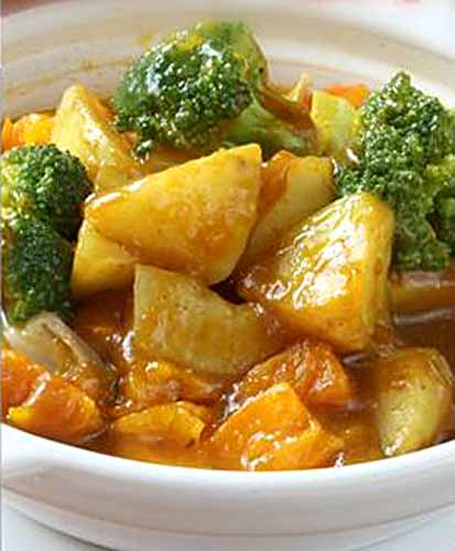 2、起锅热油,加入姜片炒香,再加入咖喱稍炒(用小火),接着加入适量水,先倒入土豆小火炖十分钟左右,再倒入南瓜、草菇一起炖,熟透后加入西兰花再煮两分钟。