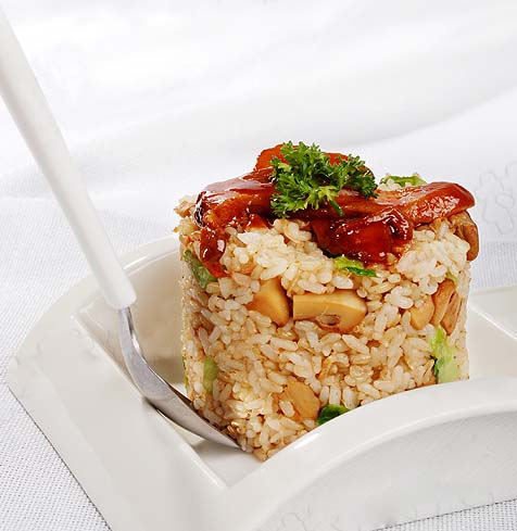 7. 炒锅内,加少许橄榄油,放松茸粒煸炒,煸干水分。放姜末略微煸炒,糙米饭、素肉松、美极鲜味汁一起煸炒。然后放入罗马生菜,中大火炒香,最后调入蘑菇精,调好口味继续大火快炒一会儿,盛入圆模中压实,装入盘中。在炒饭顶部放入步骤(5)松茸片二片,在松茸顶部用一小片欧芹点缀,然后配步骤(6)松茸功夫汤一盅即可。