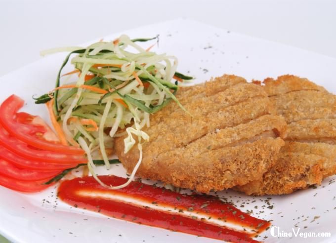素肉大片用水浸软,加淀粉、少许盐、胡椒粉捏匀,外面再蘸上面包糠,入油锅炸至表面金黄即可 (就这样也可以吃了)
