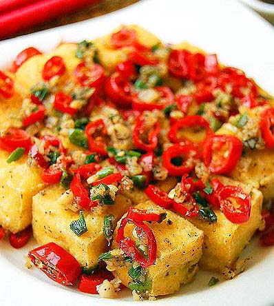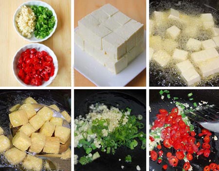 材料:老豆腐250克,新鲜红尖椒4个,葱、蒜末各1大勺,盐、蘑菇精、黑胡椒粉、花椒盐各1/2小勺、食用油适量