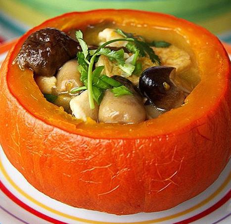 1、挑选外型漂亮的南瓜,洗净,在1/3处横向切开,掏去南瓜籽,南瓜瓤生的时候很硬,容易伤手,可以在蒸熟后,用勺子舀出;处理好的南瓜盅上蒸锅,隔水蒸20分钟;
