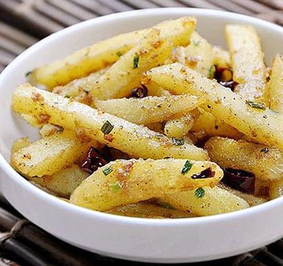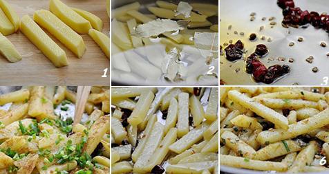 5、加入葱花和适量十三香,用筷子将调料拌均匀,使之附在土豆条上;