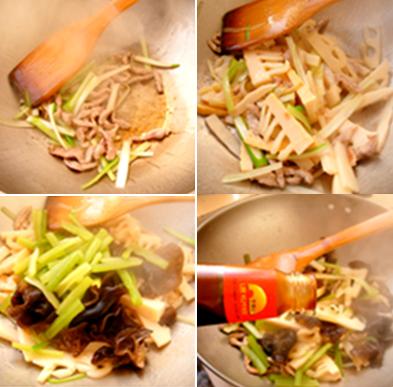 1、笋切细条下开水煮三分钟滤出(据说是为了去除笋外层的什么酸钙还是盐的,反正得煮),木耳泡发好撕成小朵,芹菜切段焯水滤干(这样比较好炒,也不会有太大的芹菜味,要不就会有点夺味),素肉丝用水泡软后挤去水分;