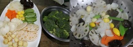 主料:西兰花、百合、莲子、银杏、银耳、黑木耳、莲藕、甜蜜豆、胡萝卜