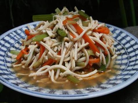 3、将干丝放入锅中,煮2分钟取出放凉,加入芹菜丝及胡萝卜丝,再加入全部调味料拌匀即可。