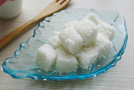 3、倒扣出定性好的椰浆糕,切小块,滚上椰蓉即可。