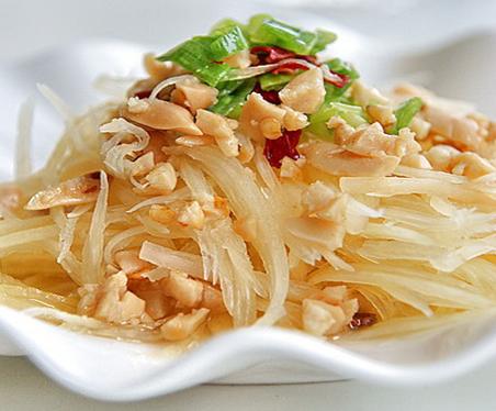 4、青木瓜丝加入调好的调料汁与一起拌匀,再撒上炒好的萧山萝卜干(或压碎的熟花生)葱花或蒜末就可以了。