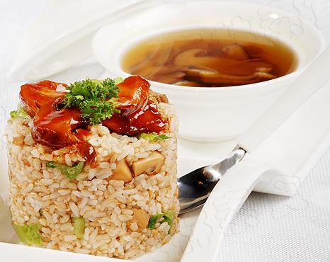 6、 炒锅内,加少许橄榄油,放松茸粒煸炒,煸干水分。放姜末略微煸炒,糙米饭、素肉松、美极鲜味汁一起煸炒。然后放入罗马生菜,中大火炒香,最后调入蘑菇精,调好口味继续大火快炒一会儿,盛入圆模中压实,装入盘中。在炒饭顶部放入步骤(5)松茸片二片,在松茸顶部用一小片欧芹点缀,然后配步骤(6)松茸功夫汤一盅即可。