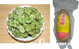 2、锅置中火上烧热,倒入精制油至热时,将蚕豆倒入,约煸炒10秒钟,把素火腿丁下锅,芝麻油,加白糖和精盐,烧一分钟,,用湿淀粉调稀勾芡,颠动炒锅,淋上压榨植物油,盛入盘内即成。