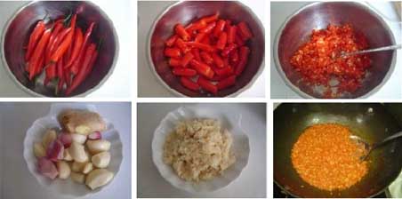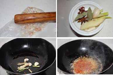 大蒜50克、大葱75克、大料20克、辣椒面500克、豆油1500克