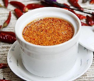 2、另起锅,入菜油,四成热时,下姜片、小葱炸至干香时,熄火,冲入装有糊辣椒末的盆中,搅拌至四成热时,放入花生米、熟芝麻,封口即成。特点色泽深红,辣味十足。