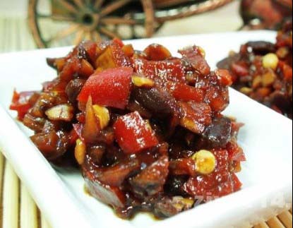 鲜红辣椒2斤、食油1斤、大豆蛋白或花生蛋白半斤(蛋白肉)、蘑菇精5两、食盐3两、白糖2两、生姜3两、花椒面1两、甜面酱5两、花生米3两(炒后压碎)、芝麻2两(炒后压碎)