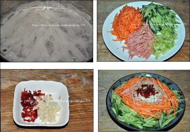 原料:粉皮、黄瓜、红萝卜、素火腿肠、水芹菜、蒜、干红辣椒。