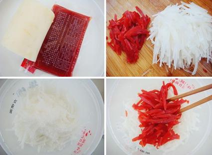1、白萝卜和山楂糕分钟洗净切丝。