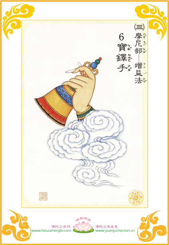 这一个手眼叫什么呢?叫「宝铎手」。宝铎手,就是拿着一个宝铎来一晃,这是第三十手。宝铎手是一种音乐,这么拿着一晃铃子,「当当当」就响起来了。这一响,空中也响,天上也响,三千大千世界都震动了,都「当当」起来了;你想要做什么事情,一切的天人、鬼神、妖魔都要听这个命令,都要守规矩。就好像明明地震了,你一晃这个,各处都发号施令:「不准地震!」喔!地就不震了。果地,你记得吗?宝铎手的用处可大了。你若想唱歌唱得声音好,也要用这个宝铎手;宝铎手修好了,你声音就像洪钟那么响亮,说出话来就「嗡!嗡!嗡!」声,像敲钟那么响。