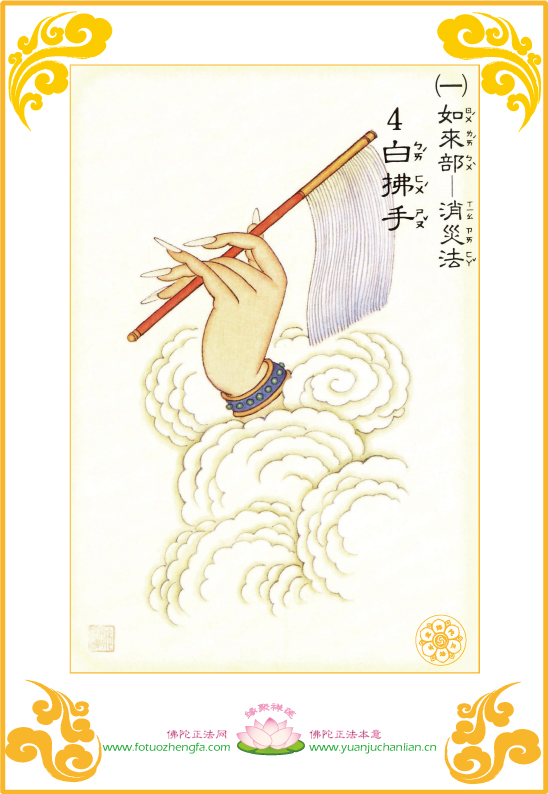 这个手眼叫什么呢?就是「白拂手」。白拂,广东人就叫尘拂,北方人叫拂尘;正是好像英文和中文似的调过来,都是这两个字。广东又有一个俗名,叫「神仙手」。本来在中国,老道、和尚有的拿着,就是赶苍蝇用的东西。但是这个东西叫拂尘,是中国的法师上堂说法时所拿着的。你们如果不知道,我有一个;大约这一次他们都会给我带回来,也会带回一个如意。我这个如意,是很古老,大概是汉朝的。这个拂尘——白拂手,是预备干什么的呢?这能除身上所有一切的障难。你所有的业障、病痛、用拂尘给你扫一扫;如果是业障病或是魔障病,病就会好了。这个拂尘用途很大,不过会用的人很少;我知道,现在很少。