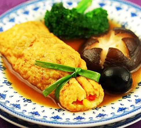 11. 取出后码放在盘中,香菇刻花焯水码在盘中,西兰花焯水取一小朵码放盘中。锅中倒入素蚝油+适量的清水,中火至开,调上少许薄芡汁搅拌均匀。把素蚝油汁淋在码好的盘子上即可。