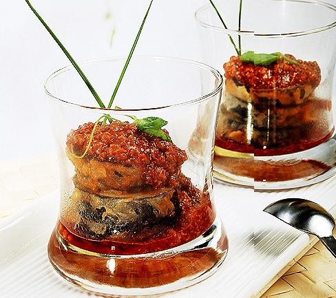 5、净锅内加入精制油,大火加热至6成熟,放入步骤(1)的茄子,炸成金黄色捞出,沥干油分。放在玻璃杯中,上面淋步骤(4)的素肉末番茄沙司,最后用竹子叶芯点缀即可。