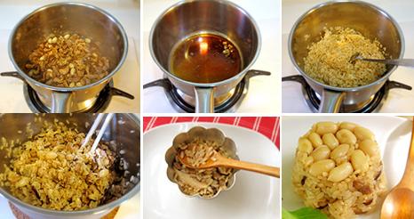 大米200克、糯米400克花生米200克、香菇5朵、洋葱碎适量、素五花肉丁300克、香菜、素肉松少许作点缀