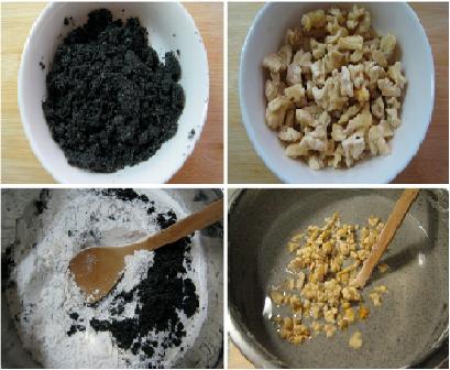 1. 黑芝麻用白锅炒香后,放入搅拌机中搅成粉状
