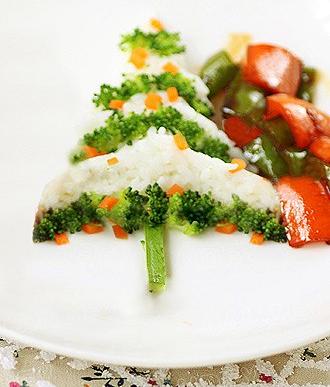 1、煮好的米饭稍放凉,用四个由小至大的饭团做出层层叠叠的圣诞树体;