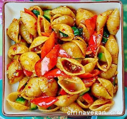 材料:意大利贝壳面(其他块状的意大利面,如蝴蝶面、螺丝面都行)100克、红椒1只、黄瓜半根、葱10克、蒜10克(约2瓣)、姜5克、泡红辣椒10克、盐少量、白糖5克、醋5克、酱油1克、素高汤(或者水)30克、湿淀粉15克、油。